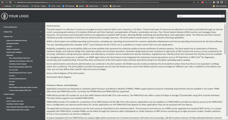 I worked with a team to create a single source proof-of-concept for the fictitious Tech Company. We used Madcap Flare and Madcap Central to create a searchable knowledge base, as well as two print installation and configuration guides implementing topic-based authoring, for Tech Company’s enterprise-class server, Zen4. We also wrote a cover letter to accompany the deliverables. Samples of our final artifacts are shown below.